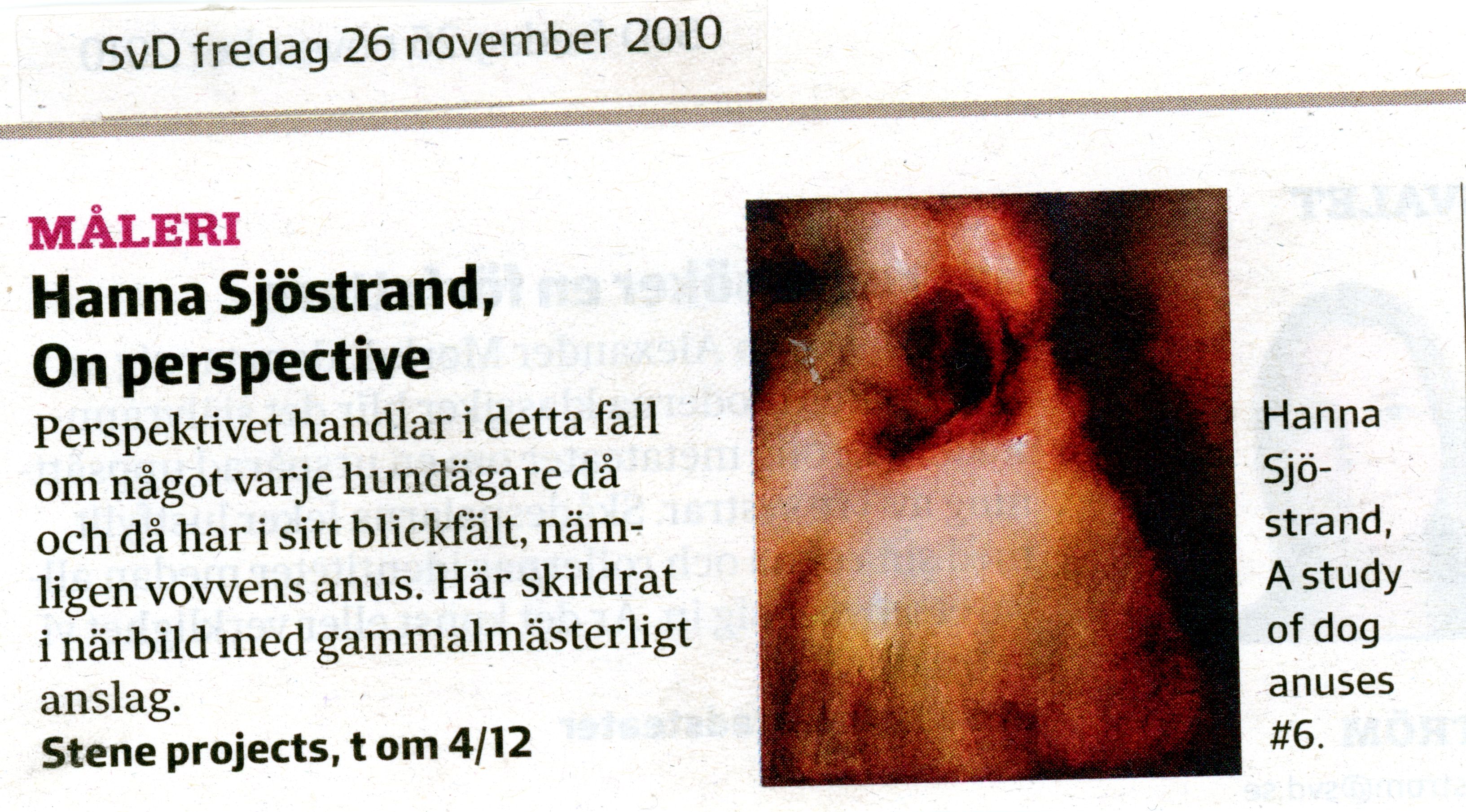 Nu har ännu en kandidat som satsar mer på räckvidd än kvalité och estetik dykt upp. Det är Hanna Sjöstrand som smygstartade lite på Malmö konsthall 2009 med ”Stjärtens ansikte – ett undersökande av baksidans semiotik” och nu fortsätter med ”A study of dog anuses”. Hundarslen i olja på träfiberskiva.