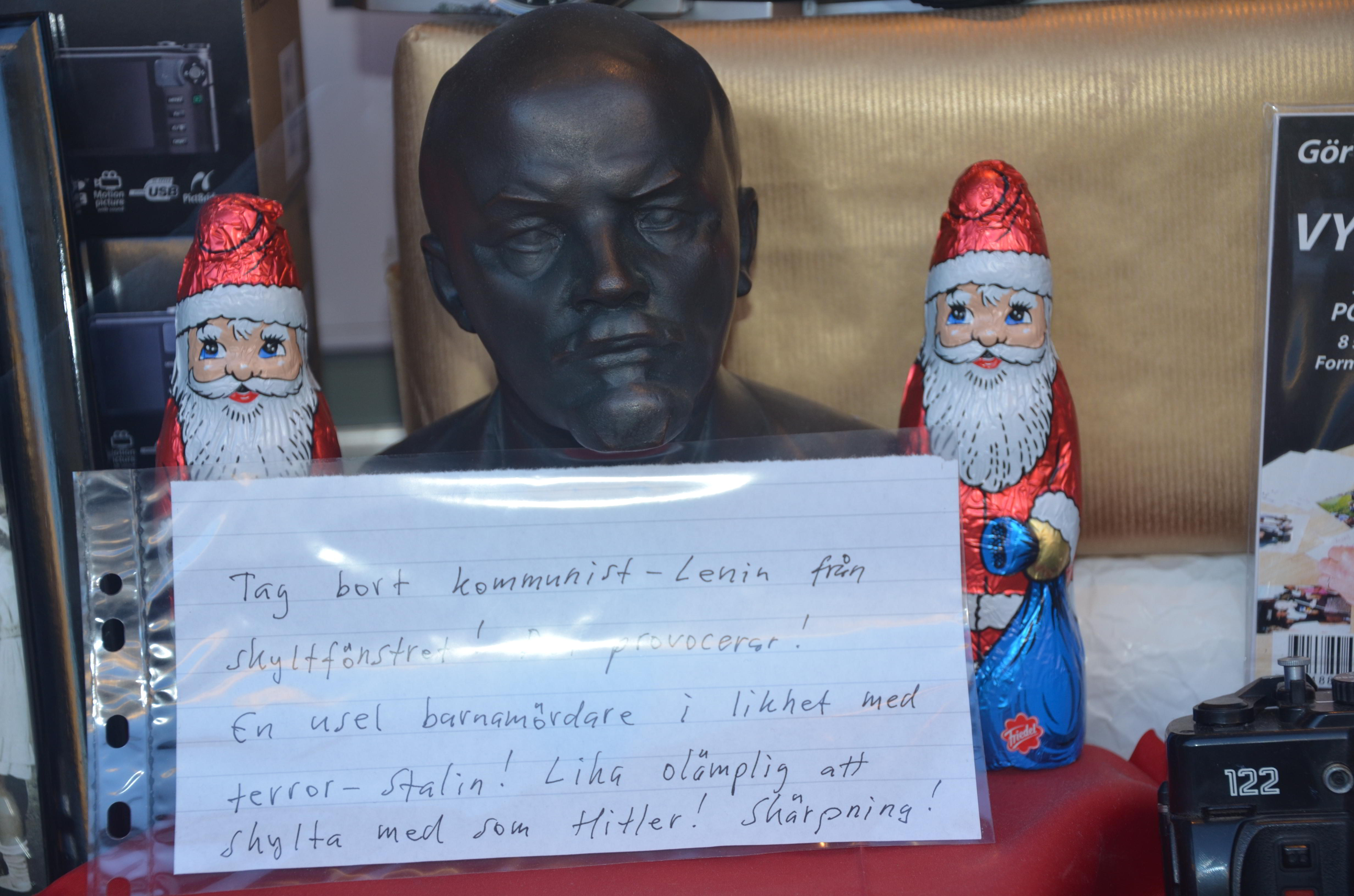 Texten lyder: Tag bort kommunist-Lenin från skyltfönstret! Det provocerar! En usel barnamördare i likhet med terror-Stalin! Lika olämpligt att skylta med som Hitler! Skärpning!